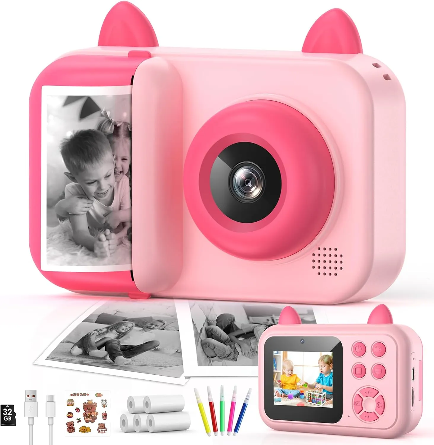Instant Camera, 2.4" Screen Kids Camera with Printing Paper and 32GB Card & 5 Rolls of 1080 Printing Paper, Disposable Camera, Gifts for Boys and Girls Ages 3-12